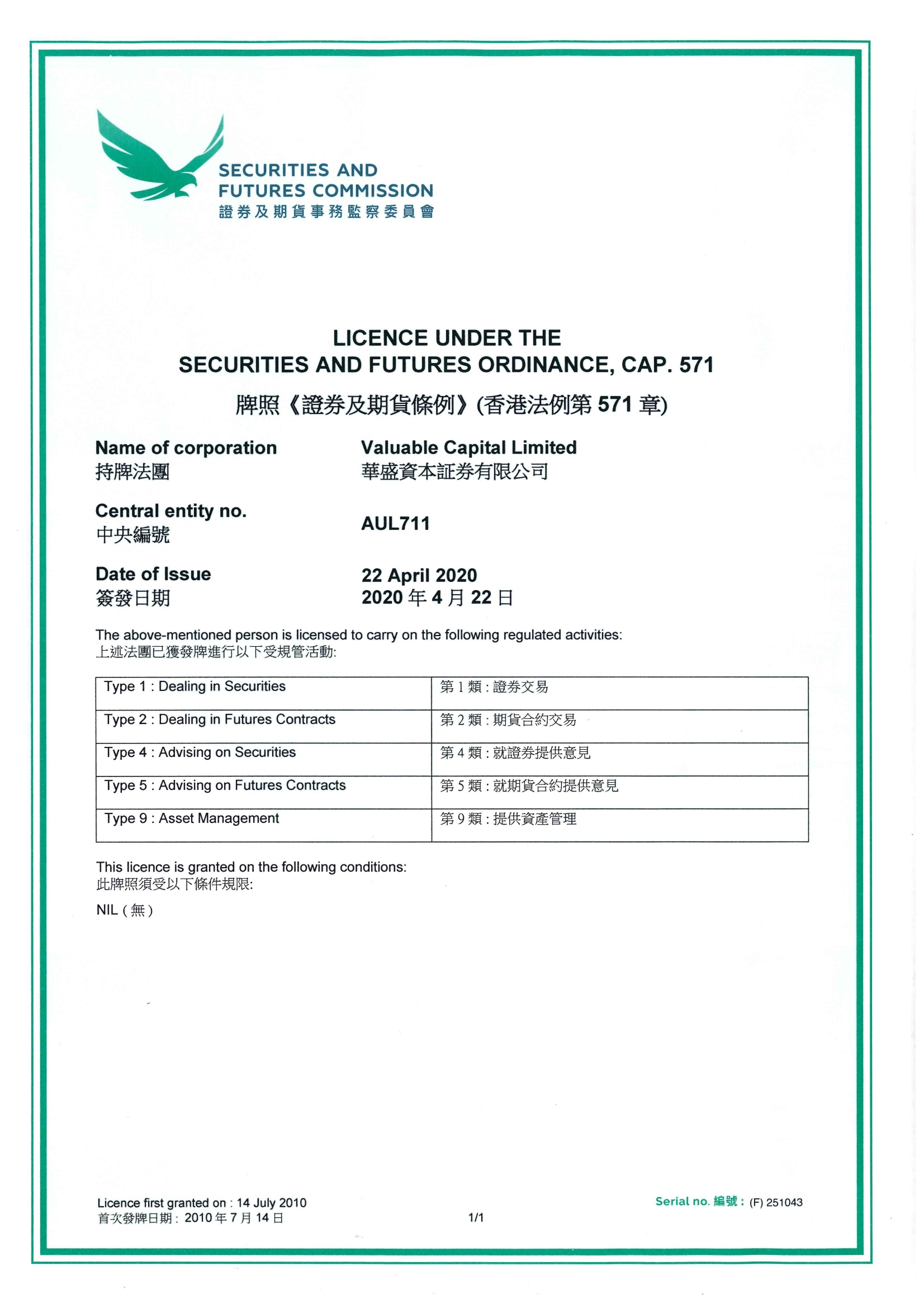華盛証券(Valuable Capital Limited)是香港證監會許可的持牌證券經紀商(中央編號:AUL711)持有香港證監會授予的證券交易( 第1號)、期貨合約交易( 第2號)、就證券提供意見( 第4號)、就期貨合約提供意見( 第5號)、提供資產管理( 第9號)牌照